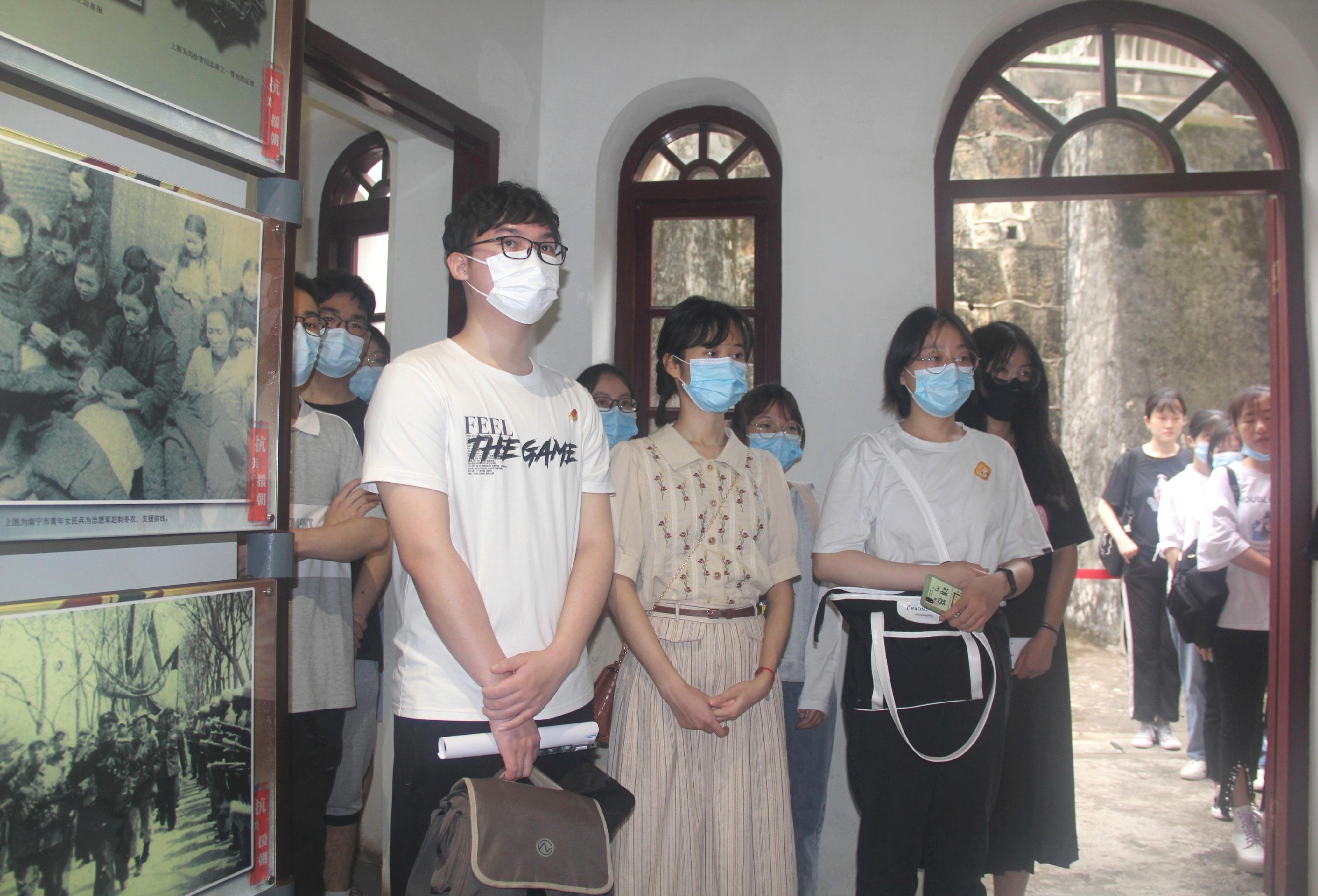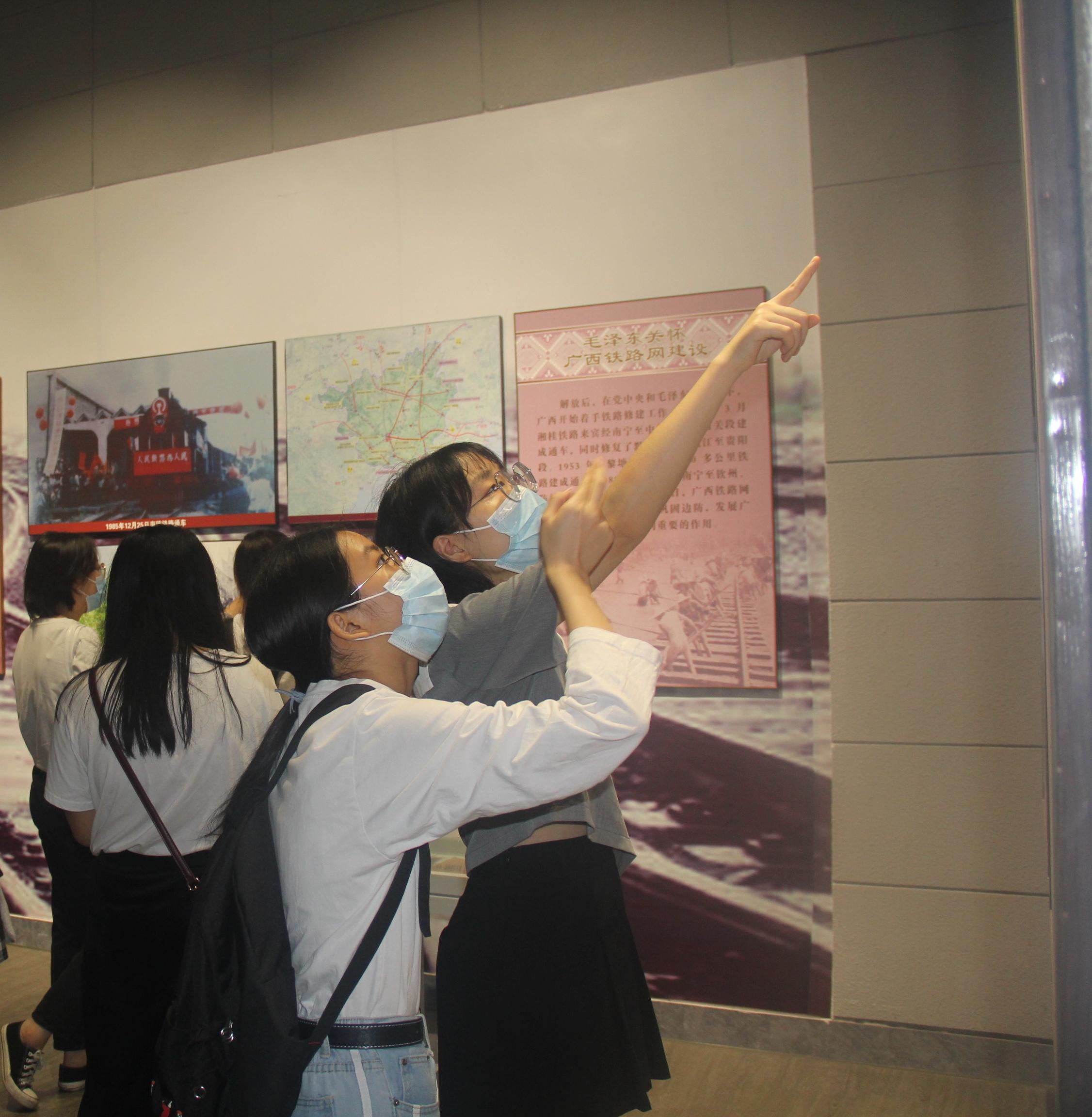 在现场教学环节中,同学们跟随讲解员的讲解,在南宁近现代国防历史文化陈列馆与毛主席接见广西各族人民纪念馆参观学习。两个陈列馆内分别陈列有军事、历史文化遗迹,历史时刻复原场景以及大量文献资料,南宁近现代国防历史文化陈列馆的17间展厅陈列有辛亥革命、新旧桂系、南宁兵变、南宁抗战、南宁解放、南宁剿匪、抗美援朝、援越抗美、对越自卫还击作战等9个板块的内容,集中展示了南宁市近现代历史变迁、光荣革命史和国防文化,南宁兵变前后的历史既展现了中国共产党的发展历程,也是对中国共产党的组织建设、思想建设与统战工作的重要性的生动诠释,学员们边走边看边听边学,接受革命历史与国防文化的教育和熏陶。