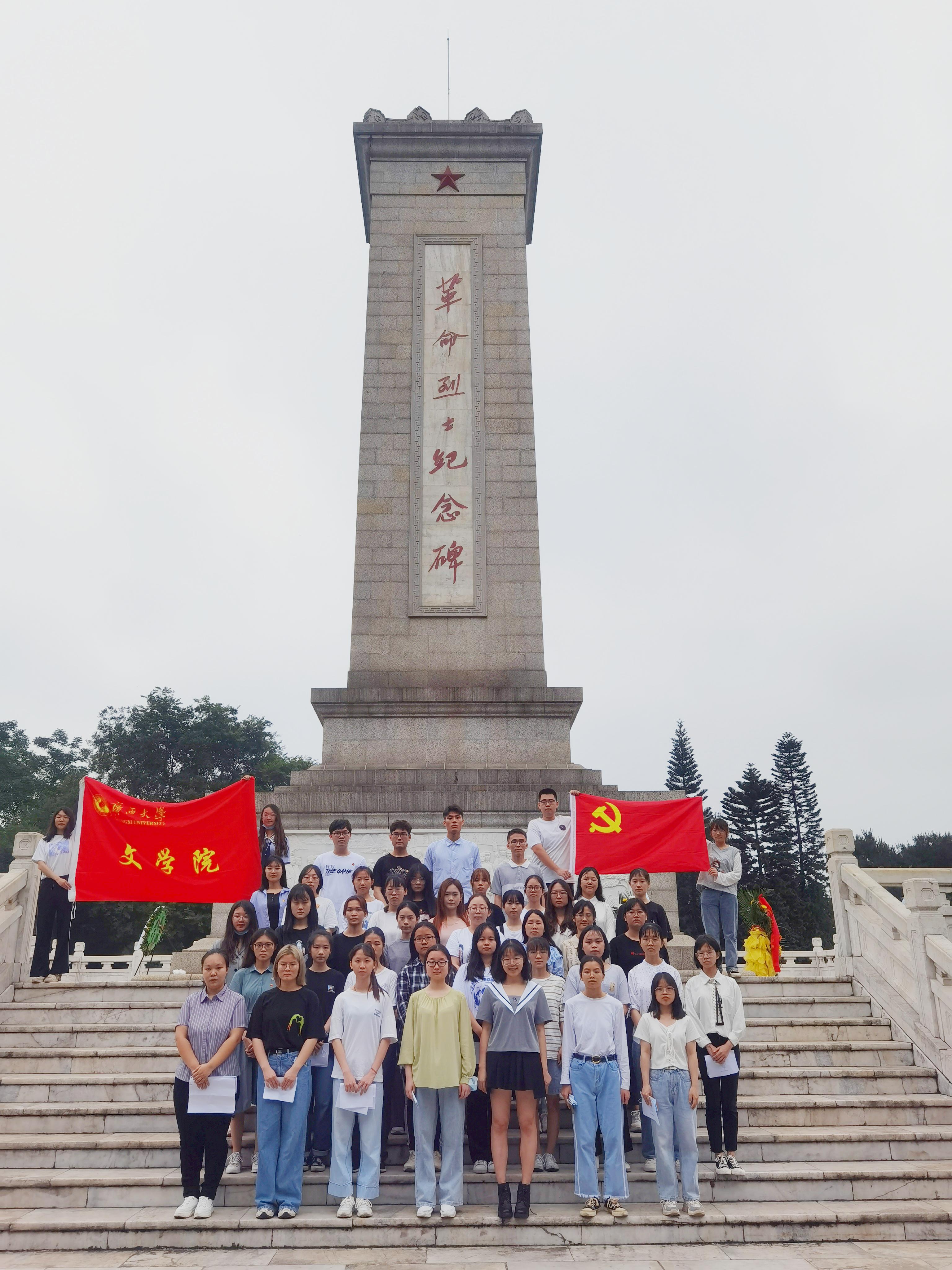 现场教学结束后,同学们来到南宁革命烈士纪念碑前开展缅怀革命先烈的活动,同学们为革命先烈敬献花圈,在革命烈士纪念碑前诵读祭文诗词,表达对革命先烈的敬意和缅怀之情。有同学动情地说道:“国家建设靠的不仅是冷冰冰的枪炮,更有人民对于祖国的一颗赤诚真心,我们要时刻铭记今天和平幸福生活的来之不易,要肩负起时代赋予我们的责任与使命。”