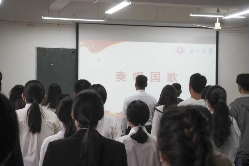 本次研代会主持人为第十三届主席团成员闫海凌同学。主持人宣布会议正式开始,随后进入第二项议程:全场起立,奏唱国歌。