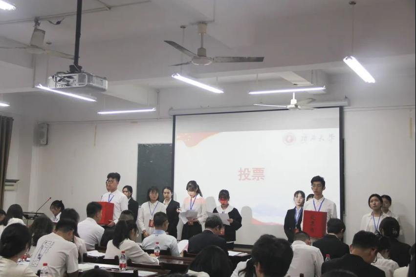 代表们填写选票后进行投票,经过严格的唱票计票过程,总监票人宣布选举结果。罗佳祺、戴园梓、袁磊当选为william威廉亚洲第十四届研究生会主席团成员。