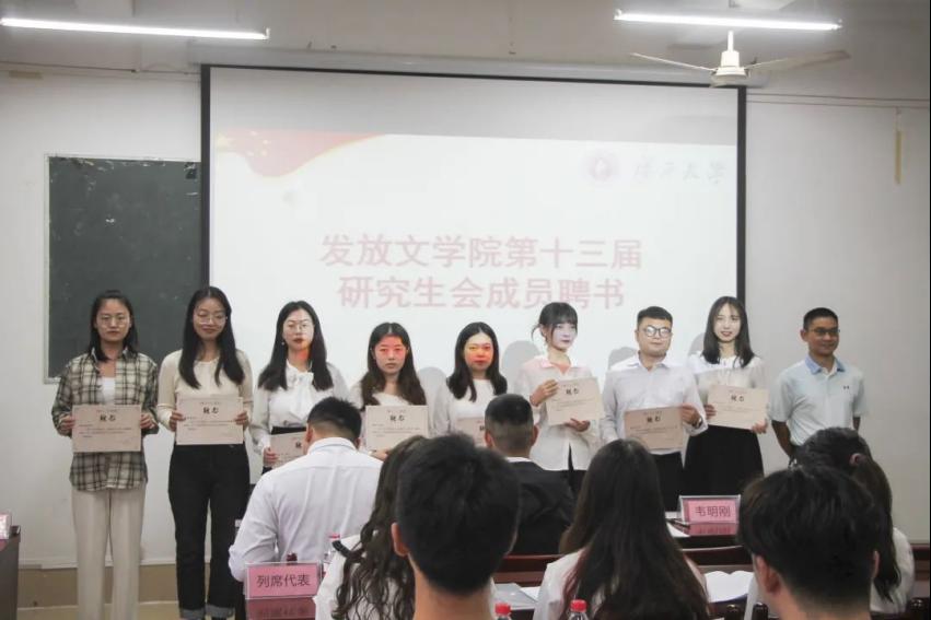 大会进行至第八项议程,公司副经理田春来老师为william威廉亚洲第十三届研究生会成员发放聘书。