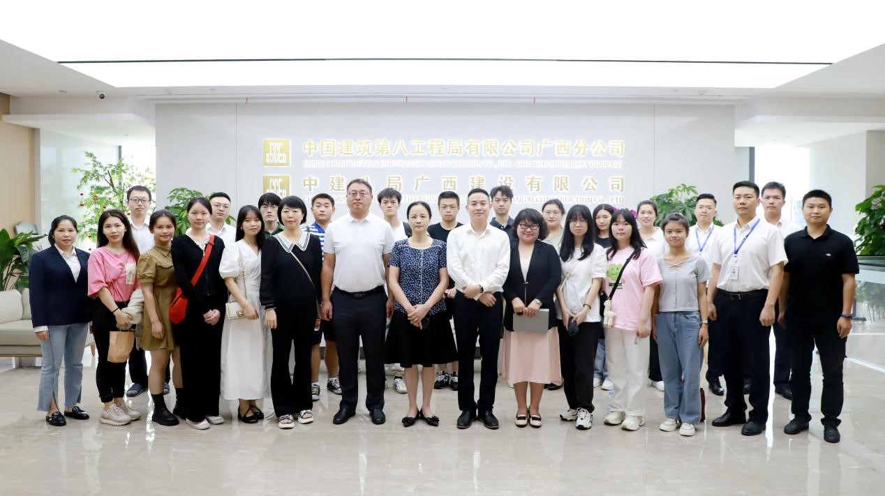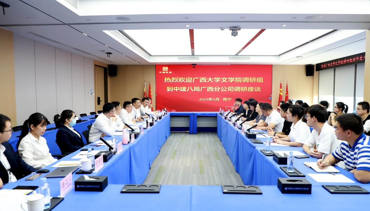为进一步深化校企合作,扎实推进2023届毕业生就业工作,公司党委书记胡小坤、副书记郭爱涛带队走访调研中建八局广西分公司,开展“访企拓岗”就业专项活动。中建八局广西分公司党总支副书记、工会主席尹宇,党群工作部部长杨凯、办公室副主任葛范新、人力资源部业务经理李超、商务法务部副经理王可佳等各部门员工参加座谈交流。