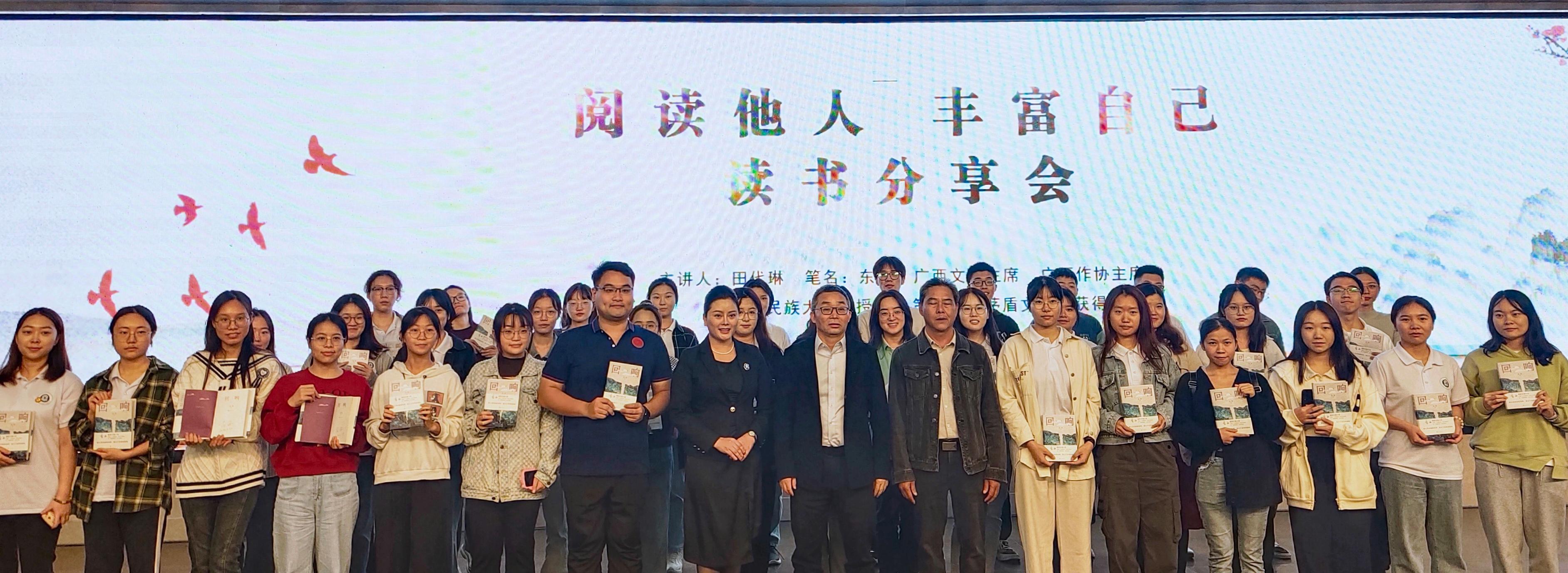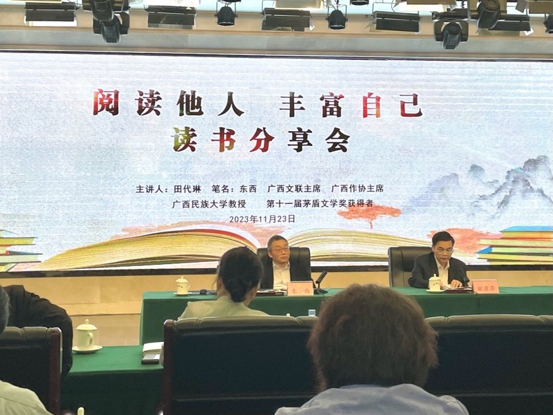 2023年11月23日上午,广西文联主席、广西作家协会主席、广西民族大学教授、广西首位茅盾文学奖获得者东西(田代琳)在自治区政协同心会堂三楼多功能厅作主题为“阅读他人丰富自己”读书分享会。会议由自治区政协副秘书长班源泽主持,公司组织20名师生代表参加分享会。