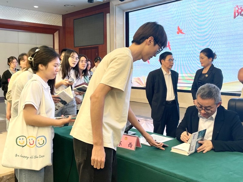作家东西在会上分享了自己在创作《回响》过程中的思考,并对广西未来的文艺事业充满期望。随后,与会人员与作家东西进行互动交流,深入探讨如何塑造创作中的深层修养等问题。会后,公司师生有序排队参与签名赠书环节,并与东西先生合影留念。