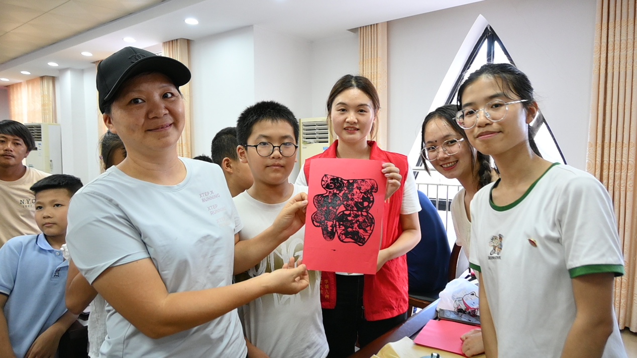 “送教下乡第三课”——中华优秀传统文化才艺展示。实践团成员一一上台展示太极拳、书法、年画拓印等中华才艺。其中,丁铭阳一段刚柔相济的杨氏太极拳引得众人啧啧赞叹,宁颖和王煦凯的书法作品展示让孩子们惊叹于中国书法独特的艺术魅力,黄倩洁带来的年画拓印则是最让孩子们跃跃欲试的传统文化体验项目。展示结束后,孩子们热情高涨,纷纷来到各个中华优秀传统文化才艺体验场地,在小老师们的带领下开展体验活动,场面活跃轻松,充满欢声笑语。