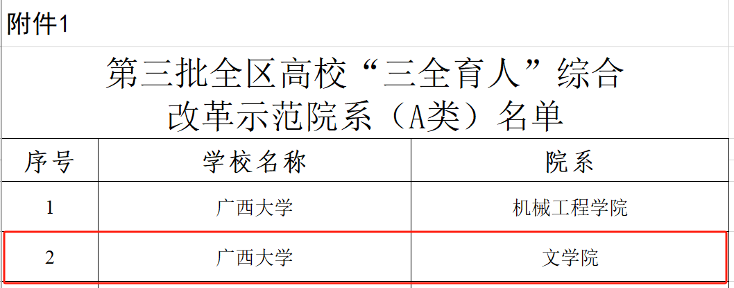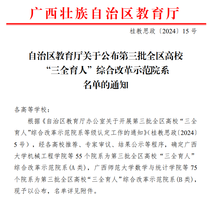 近日,广西壮族自治区教育厅发布了《关于公布第三批全区高校“三全育人”综合改革示范院系名单的通知》,公司成功获批为A类综合改革示范院系。 公司将以本次获批为契机,按照区教育厅“三全育人”综合改革示范院系建设工作要求,牢固树立为党育人、为国育才使命担当,全面落实人才培养中心地位,不断完善大思政育人格局,促进人才培养质量提升。