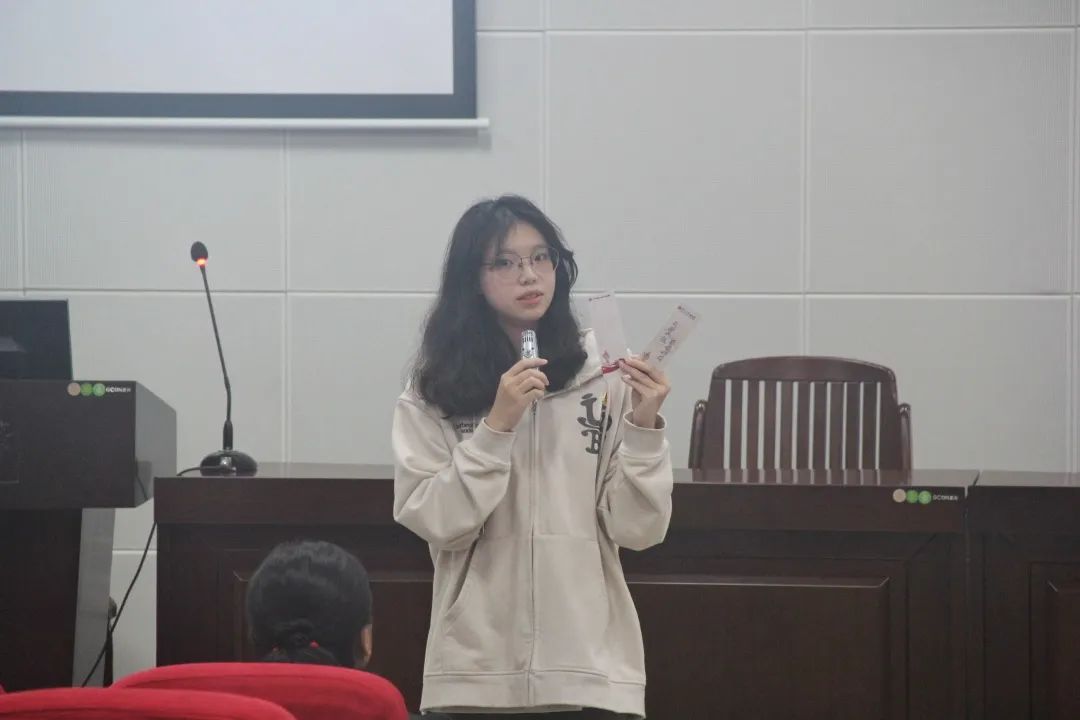 接下来,由轻工与食品工程公司党委副书记唐旭彬老师做活动总结。唐旭彬老师首先对各位老师和同学们为本次活动付出的努力表达了感谢;其次,她引用习近平总书记的话语来强调读书的重要性和必要性,要把读书当成提升自我的方式;最后,她还分享自己读杨绛先生作品的读书心得,希望我们能带着问题去思考、去读书,真正达到王国维所说的“读书三境界”。