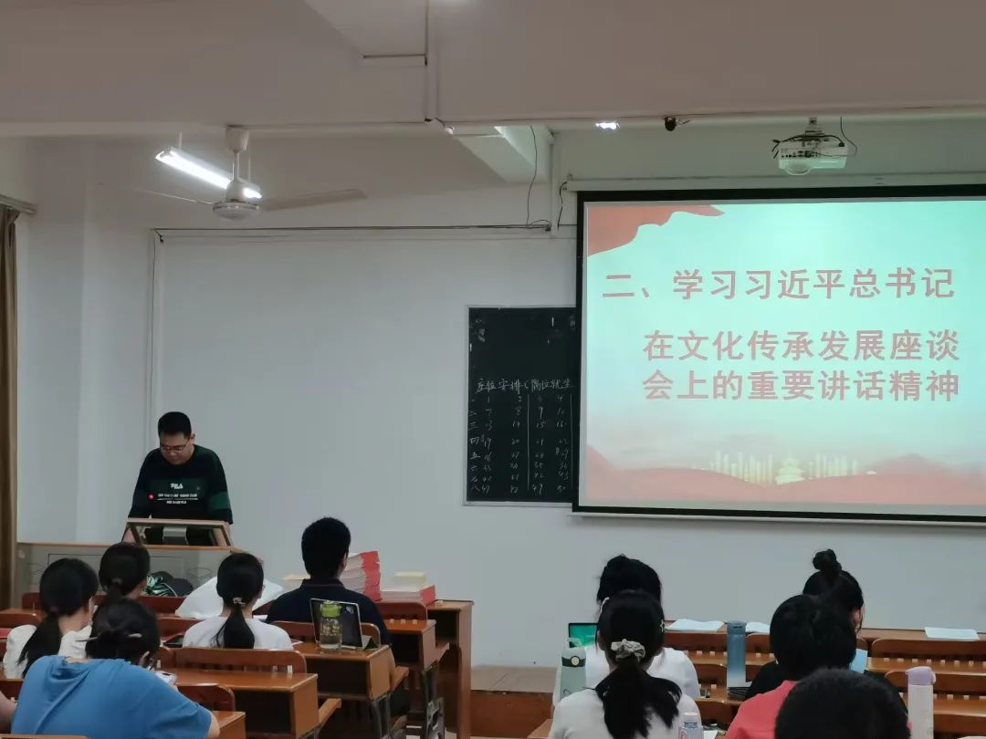 在观看学习习近平总书记在文化传承发展座谈会上的重要讲话精神环节,李丁同志分享了自己的体会。他讲到,党中央重点关注古代典籍,预示着我们对坚定文化自信、走自己的路更为重视。作为一名文学专业的员工党员,我们应当在自己的学习研究中寻找中华优秀传统文化与当今时代的契合点,并将这种可以影响当代中国的文化力量传播、分享到周围同学中去。