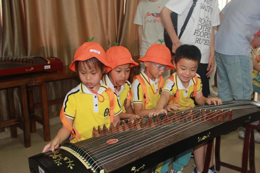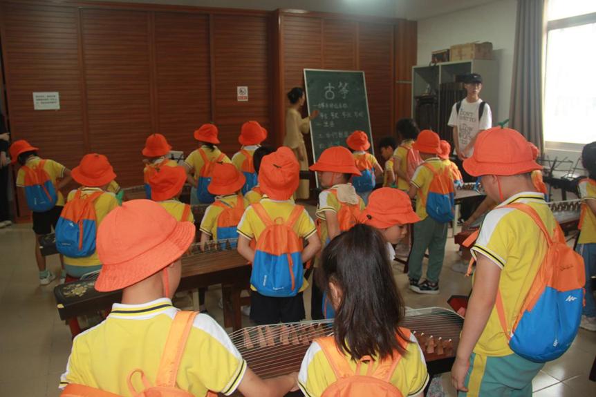 古筝曲美,美在韵味,美在古朴,美在典雅,美在纯净,美在飘逸。随后,讲解员有序引导大家来到在古筝室,介绍了古筝的历史渊源和乐器配件名称,科普古筝文化,并请小同学们实地弹奏,来共同感受典雅、优美的音乐氛围。