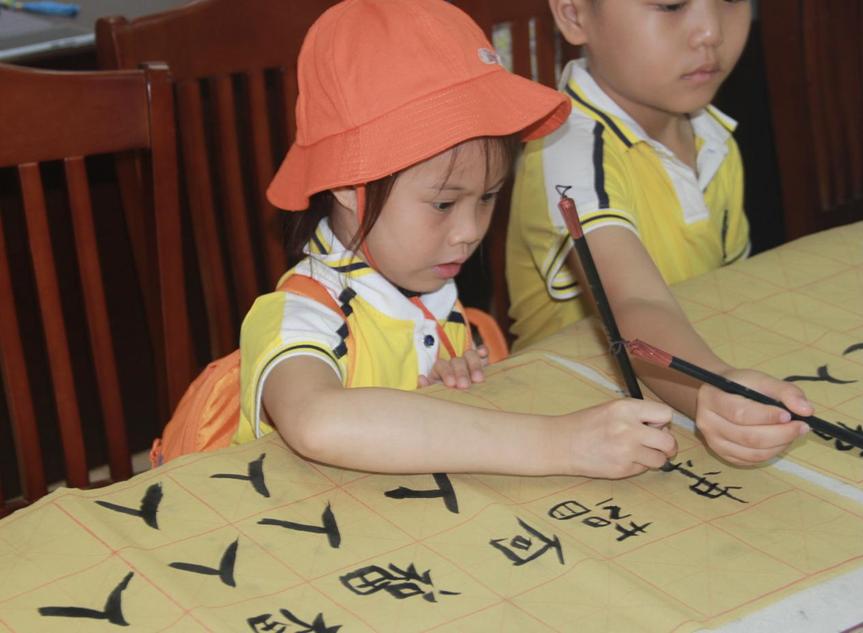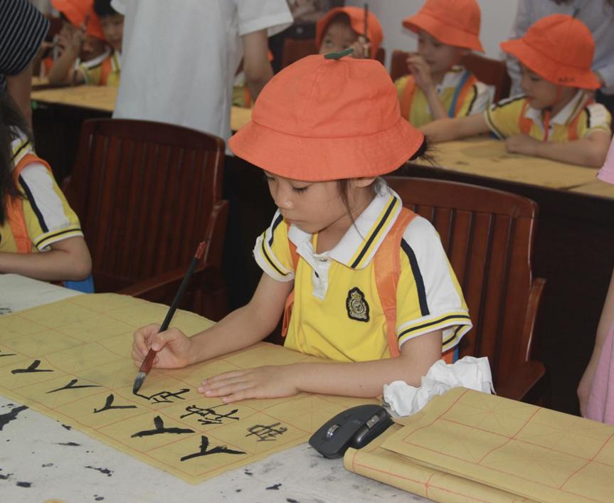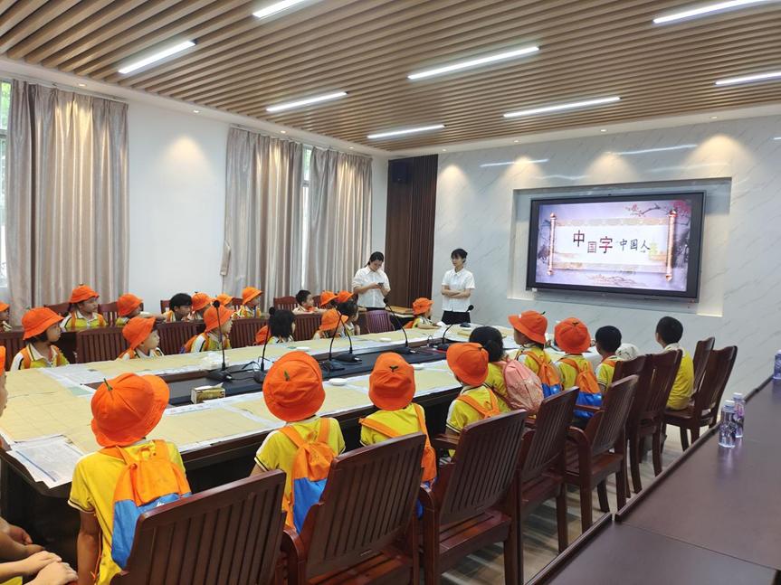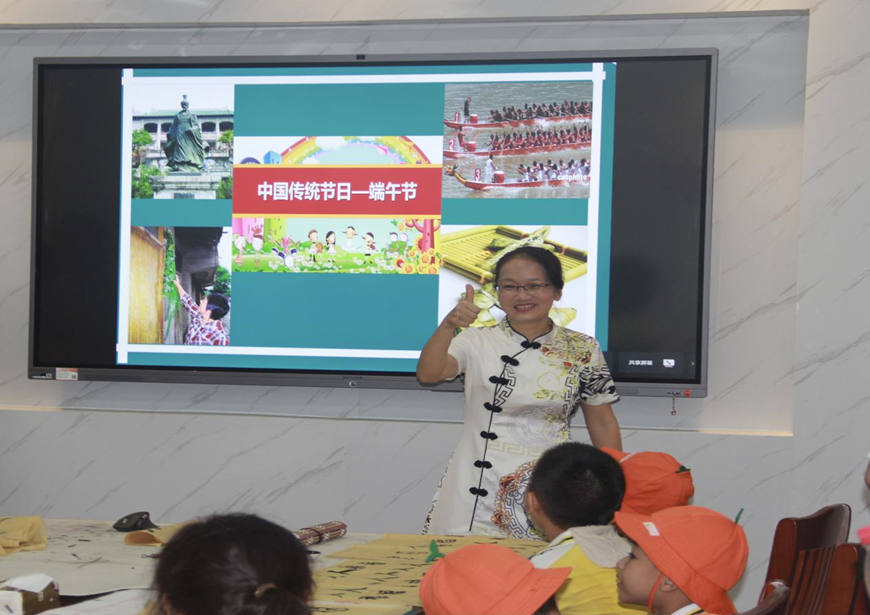 参观中,同学们在112会议室为君武小学的师生展现了书法风韵。简要介绍了毛笔的握法,耐心教授“人”、“福”等繁体字的写法,一点一捺、一顿一转,小同学们在优美的音乐声中完成了自己的第一个书法作品。王红老师为大家带来一堂精彩的中华传统文化课,娓娓道来端午节的习俗。