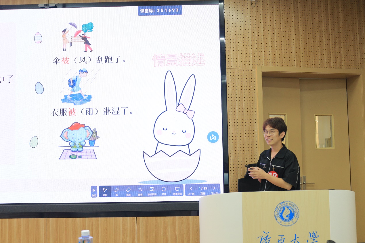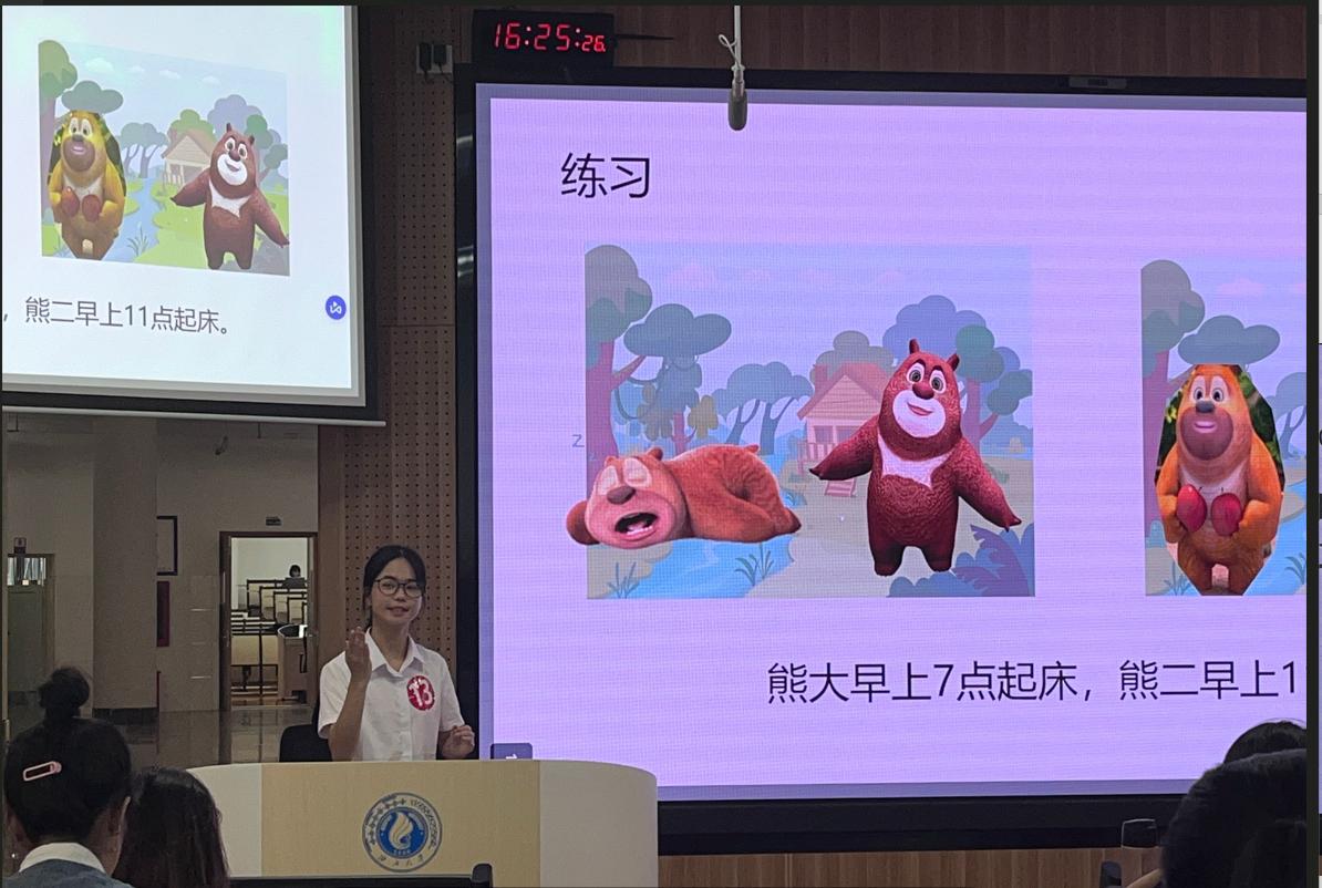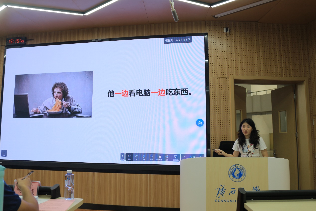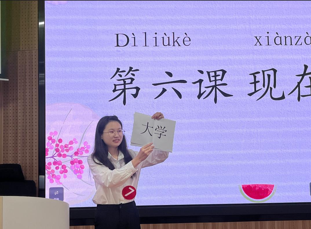 比赛分为本科生组和研究生组。参照自治区比赛赛制,在教学技能展示过程中,选手们自选语言点进行6分钟的模拟课堂展示,比赛从内容设计、教学组织、课件制作、教姿教态、语言表达、教学特色等多个评分点考核选手表现。选手们模拟真实课堂教学情境,向观众们展示了对外汉语教学过程,他们热情洋溢的讲台表现赢得了评委和观众的阵阵掌声。