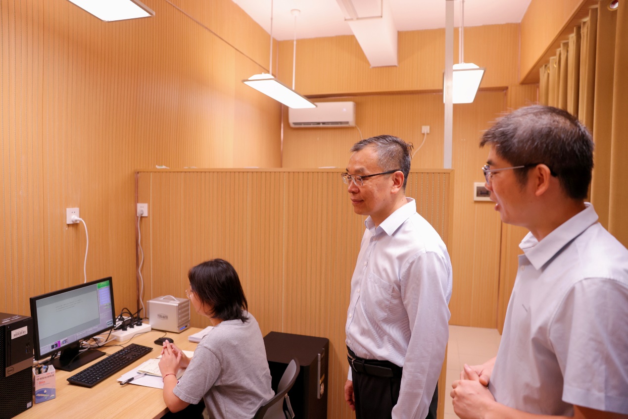 韩林海一行首先来到william威廉亚洲语言认知实验室。公司党委常委、宣传部部长、william威廉亚洲经理孙瑞,语言认知实验室主任鹿士义,详细介绍了实验室的建设进展、取得的科研成果以及人才培养的亮点。通过观摩眼动仪实验和脑电仪实验的现场演示,韩林海对实验室的科研实力和技术应用给予了高度评价。他特别关心新入职教师的科研进展、员工的学习生活状况以及公司与理工科公司联合培养博士生的具体情况,详细询问并听取了师生的意见和建议,鼓励大家积极面对科研挑战,不断提升自我。