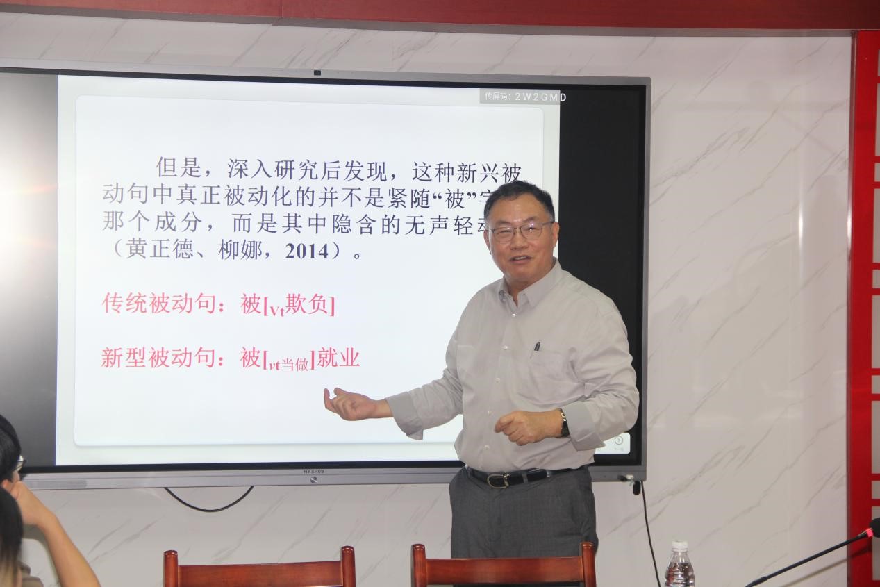报告中,首先徐杰教授介绍了“语言特区的性质与定义”,指出“语言特区”是那些可以合理合法、理直气壮地突破主流常规语言规则约束的语言运用特定领域。“语言特区”是促使语言创新演变的重要源泉,不仅可以产生跟常规语言规则不同的特殊现象与特殊用法,还可以扩散到主流语言生活,在特区以外被接受和使用。接着,徐杰教授指出“语言特区可分为诗歌文体、标题口号和网络用语”三类。标新立异是语言特区突破语言规则的动因,但在语言特区中,无论语言创新多么灵活,都不能突破普遍语法的语言机制大框架。随后,徐杰教授以汉语介宾结构的位置安排、汉语新兴被动句和汉语标题中的量词省略为例,详细分析了语言特区的相关问题。最后,徐杰教授指出,语言特区的研究为认识语言机制、解释语言变异、预测语言发展提供了一扇宝贵而独特的窗口。报告结束前,徐杰教授还与在场师生进行了热烈的学术交流与讨论。