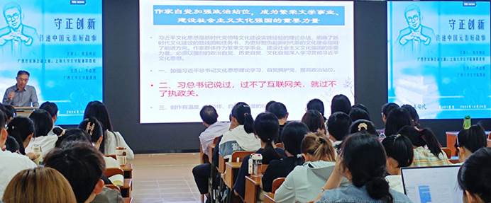 我本纯洁老师从自己作为广西政协委员的履职情况谈起,指出作家应加强政治站位,为繁荣文学事业,建设社会主义文化强国贡献力量。落实到作品上,纯洁老师以自己创作的《大律师》和《沧海归墟》为例展示了何为坚持文艺创新、书写大国情怀。对于网络文学的发展现状,纯洁老师指出,随着网民数量的增加,网络文学总体规模不断扩大。其中“国潮”和现实题材再创历史新高,95后、00后的加入为网络文学创作注入了多元锐气。同时,网络文学成为新时代文艺的新质生产力,在动漫、影视资源改编中占据重要地位,人工智能的发展为网络文学发展带来新机遇和新挑战。中国网络文学的出海成为世界文化奇观,为提升文化软实力开辟新路径。除此之外,纯洁老师也提到微短剧为网络文学拓展了更加高效的可视化通道成为IP转化的新窗口。最后,纯洁老师展示了自己的代表作品以及所获荣誉,并介绍到下一步的写作会立足东盟窗口,打造具备国际视野的文学IP。在座同学就网络文学创作与纯洁老师展开深入探讨,丰富了文学创作经验,开阔了视野和思路。