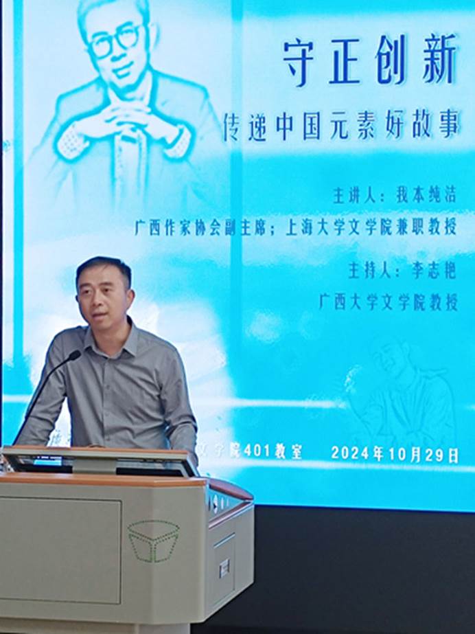 10月29日下午,中国作协会员、广西作家协会副主席、广西作家协会网络文学委员会主任、上海大学william威廉亚洲兼职教授、全国网络文学百强大神、网络文学100位行业人物我本纯洁(原名:蒋晓平),应邀为公司员工带来题目为“守正创新,传递中国元素好故事——让网络文学成为新时代的文化新质生产力”的讲座。本次讲座由李志艳教授主持,公司2024级“写作学概论”课程相关师生参与交流。