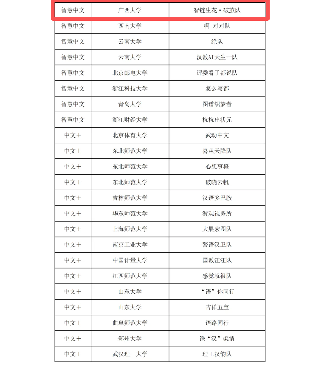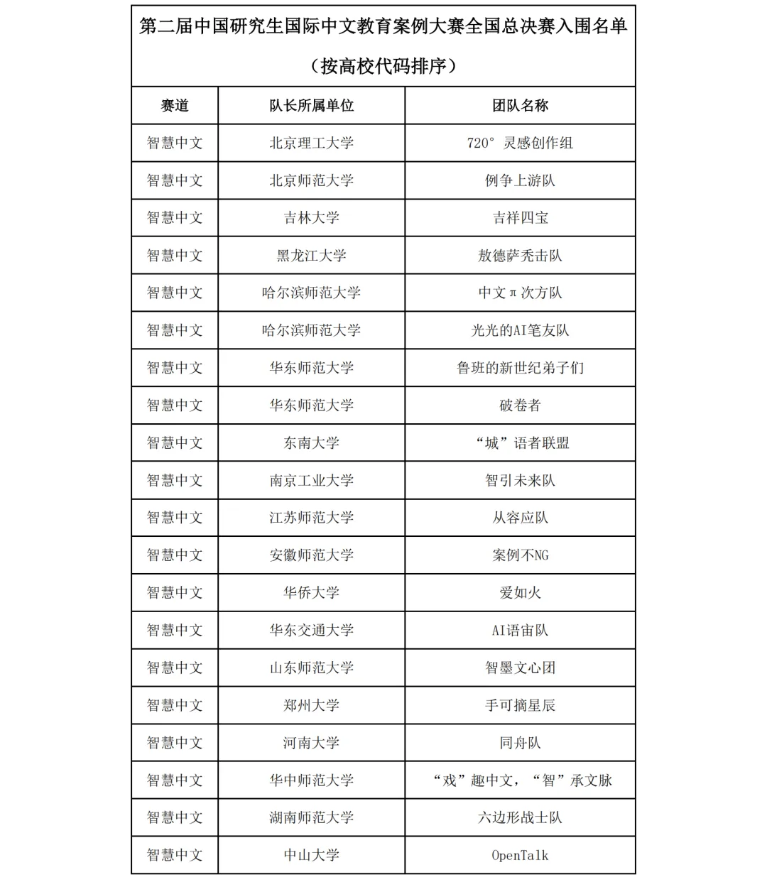 本届大赛由华东师范大学承办,主题为“数智赋能教学,中文联通世界”,共有849支队伍报名,提交有效作品800件。经126所院校的313位专家评审,共有176支队伍获奖(其中“智慧中文”赛道70支、“中文+”和“故事中文”赛道各50支、“海外本土”赛道6支),70支队伍成功入围全国总决赛(“智慧中文”赛道28支,“中文+”和“故事中文”赛道各20支,“海外本土”赛道2支),角逐大赛一、二等奖。