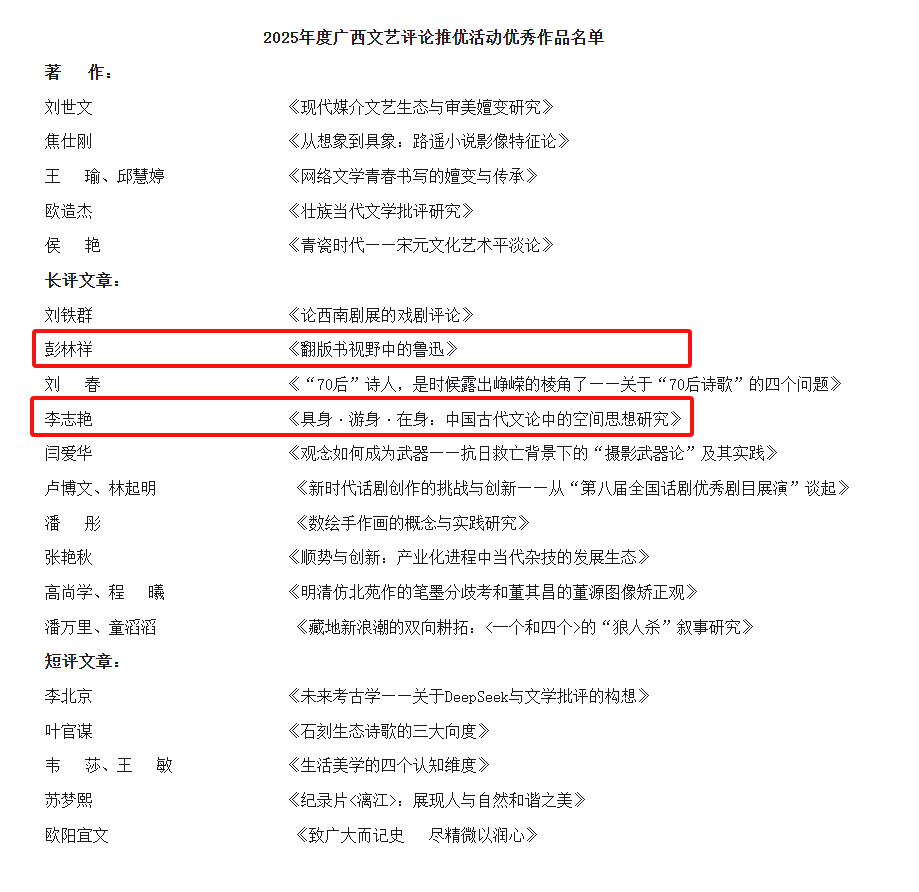 近日,2025年度广西文艺评论推优活动结果揭晓,公司李志艳教授论文《具身·游身·在身:中国古代文论中的空间思想研究》、彭林祥教授论文《翻版书视野中的鲁迅》同时摘得长评文章优秀作品奖。