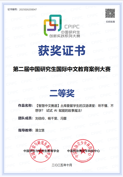 由潘立慧老师指导,刘倍伶、冯雷、杨千里(自本院考取厦门大学)三名硕士研究生组成的“智链生花·破茧队”,在“智慧中文”赛道中荣获全国二等奖。该团队案例历经多轮打磨优化,展示方案不断完善,在决赛过程中通过案例展示、案例分析、自由辩论与总结陈述等环节,与来自全国各地的参赛选手展开论辩交流,最终脱颖而出。