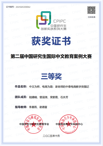由陆婧暄、荣紫霞、石水芳、曾涵溦四名硕士研究生组成的“泰韵商文筑梦队”,在李晨雨、谢德富两位老师的指导下,参与“中文+”赛道的角逐,最终荣获全国三等奖。