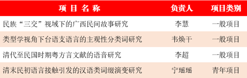 各项目负责人聚焦学术前沿,积极响应国家在文化传承与创新方面的战略导向,以高度的科研自觉主动担负起铸牢中华民族共同体意识的历史使命。研究内容充分结合广西独特地域特色,发掘历史文化基因,具有坚实的理论基础和明确的现实意义,展现了公司教师在语言学、民间文学及文献学等研究领域扎实的学术根基。