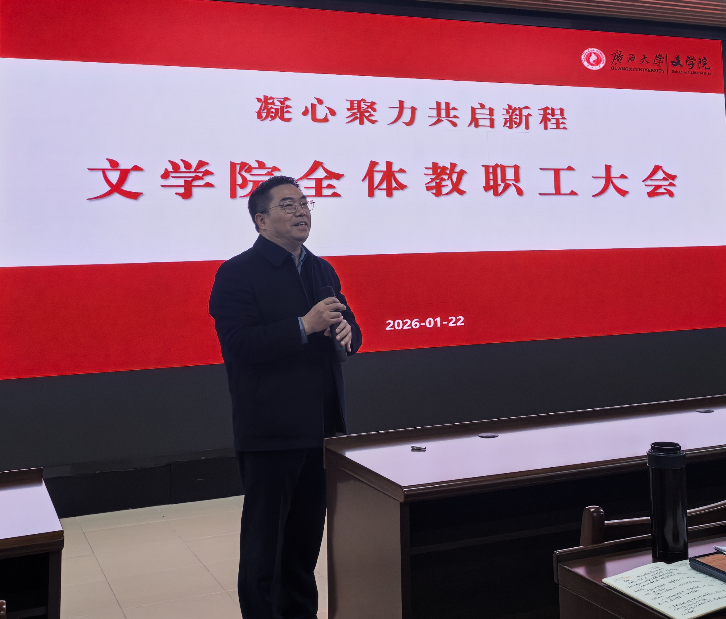 会上,银健作2025年度工作报告。他指出,2025年是公司高质量发展的攻坚突破之年,在全体教职工的凝心聚力、共同奋斗下,公司以党建引领各项事业迈上新台阶,在人才引培、科学研究、公司产品、社会服务、文化传承创新、国际交流合作等方面成效显著。他重点梳理了年度标志性成果,如获批国家社会科学基金重点项目、斩获广西文艺创作最高奖——铜鼓奖、荣获广西社会科学优秀成果一等奖、全国高校教师教学创新大赛广西赛区二等奖、广西高校青年教师教学竞赛二等奖、“推普助力乡村振兴”实践团队获评全国优秀团队并获教育部、团中央致信表扬、在《文学遗产》《世界汉语教学》等学科权威期刊发表高水平论文、6部学术著作在中华书局等权威出版社出版等成绩。他对全体教职工一年来的辛勤耕耘、无私奉献表示衷心感谢与崇高敬意。他勉励全体教职工珍惜奋斗成果,以更加饱满的热情、更加务实的作风再接再厉、奋勇争先,再谱新篇。