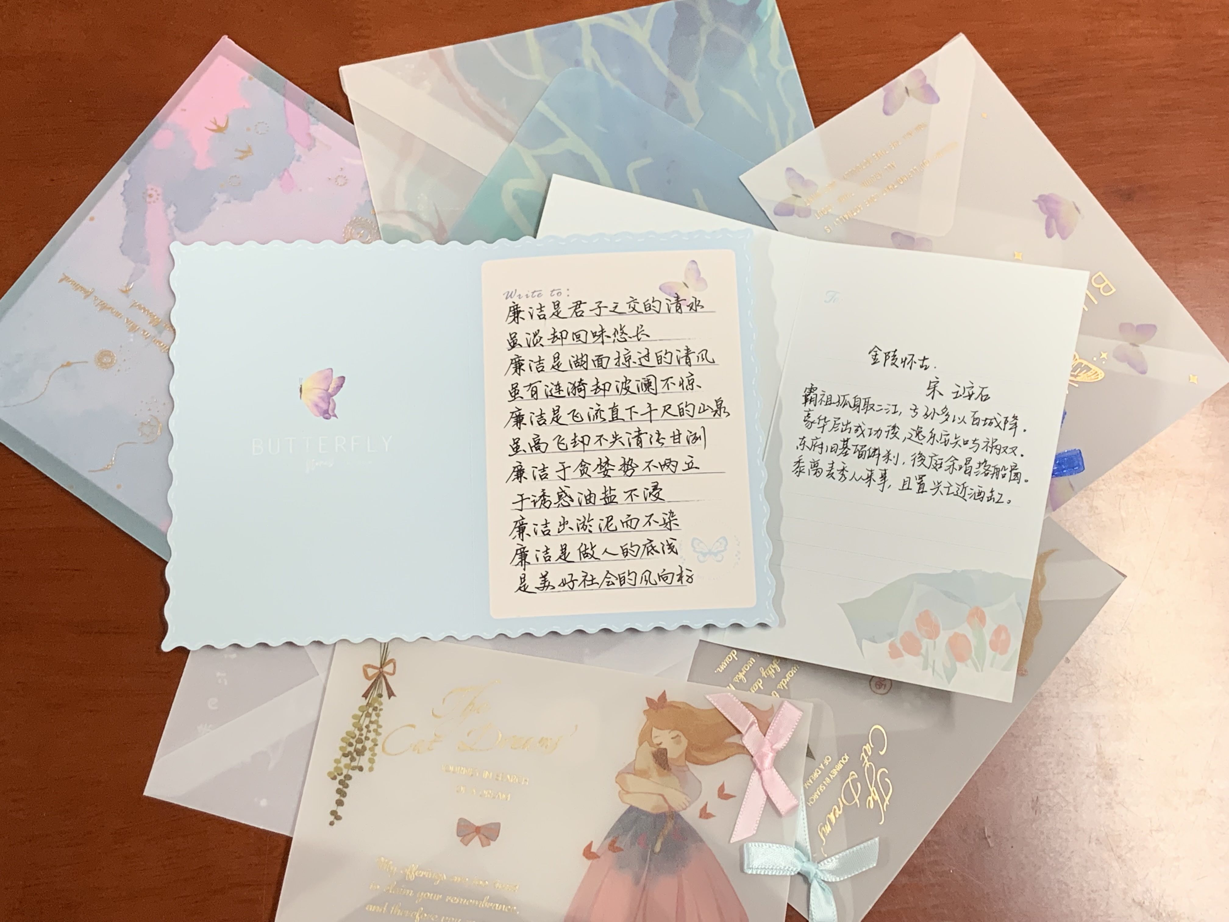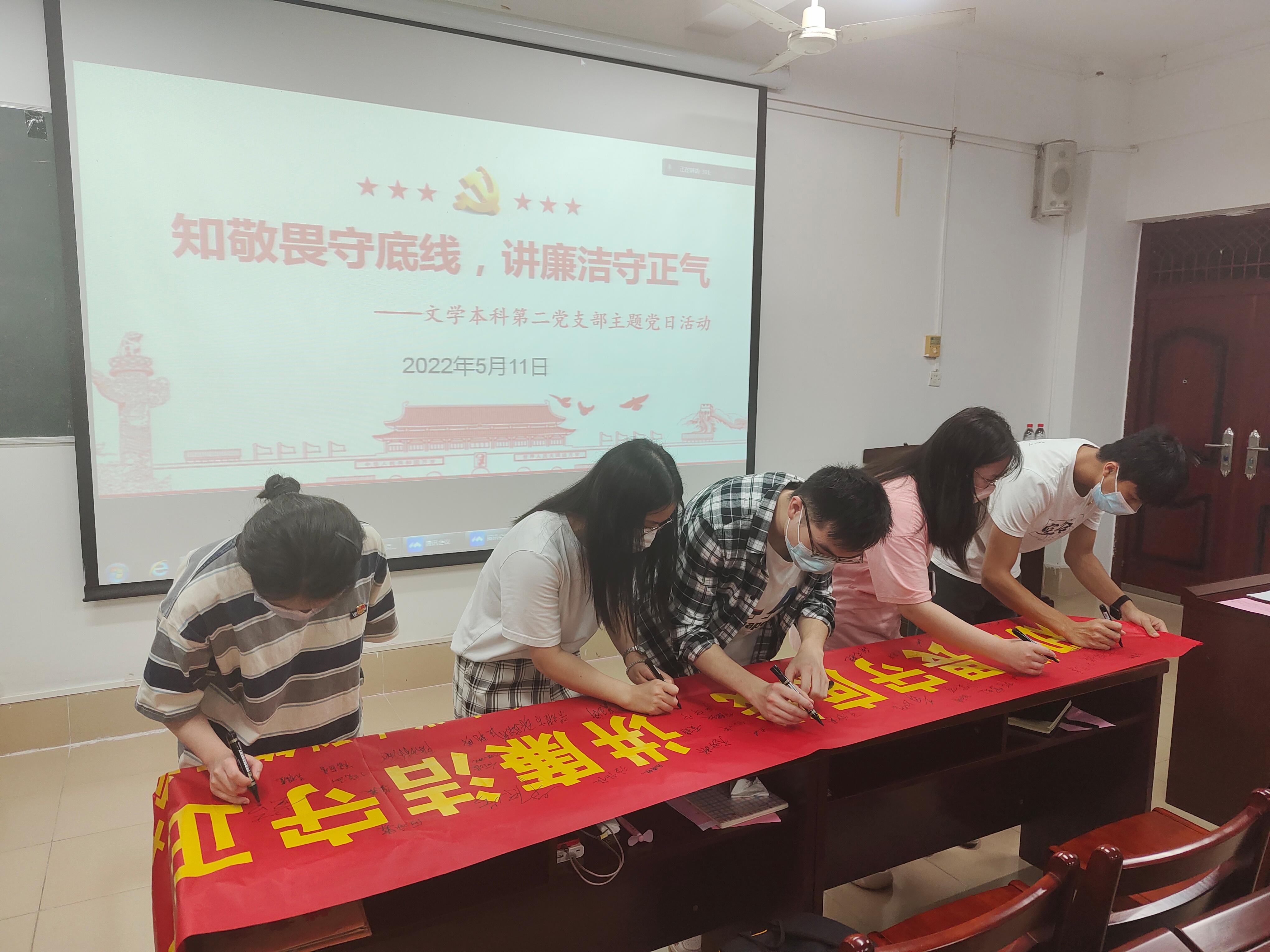 之后各师生支部开展了形式多样的活动。如诵读《廉洁颂》《陋室铭》等廉洁诗文,文学研究生党支部讲述廉洁故事、文学本科二支部进行集体签名承诺、文学本科一支部党员互赠廉洁卡片、教工第一党支部追忆红色家风,结合工作岗位特点精选提炼廉洁警示语制作警示牌,并在活动中分享关于廉洁警示语的感悟和体会等。
